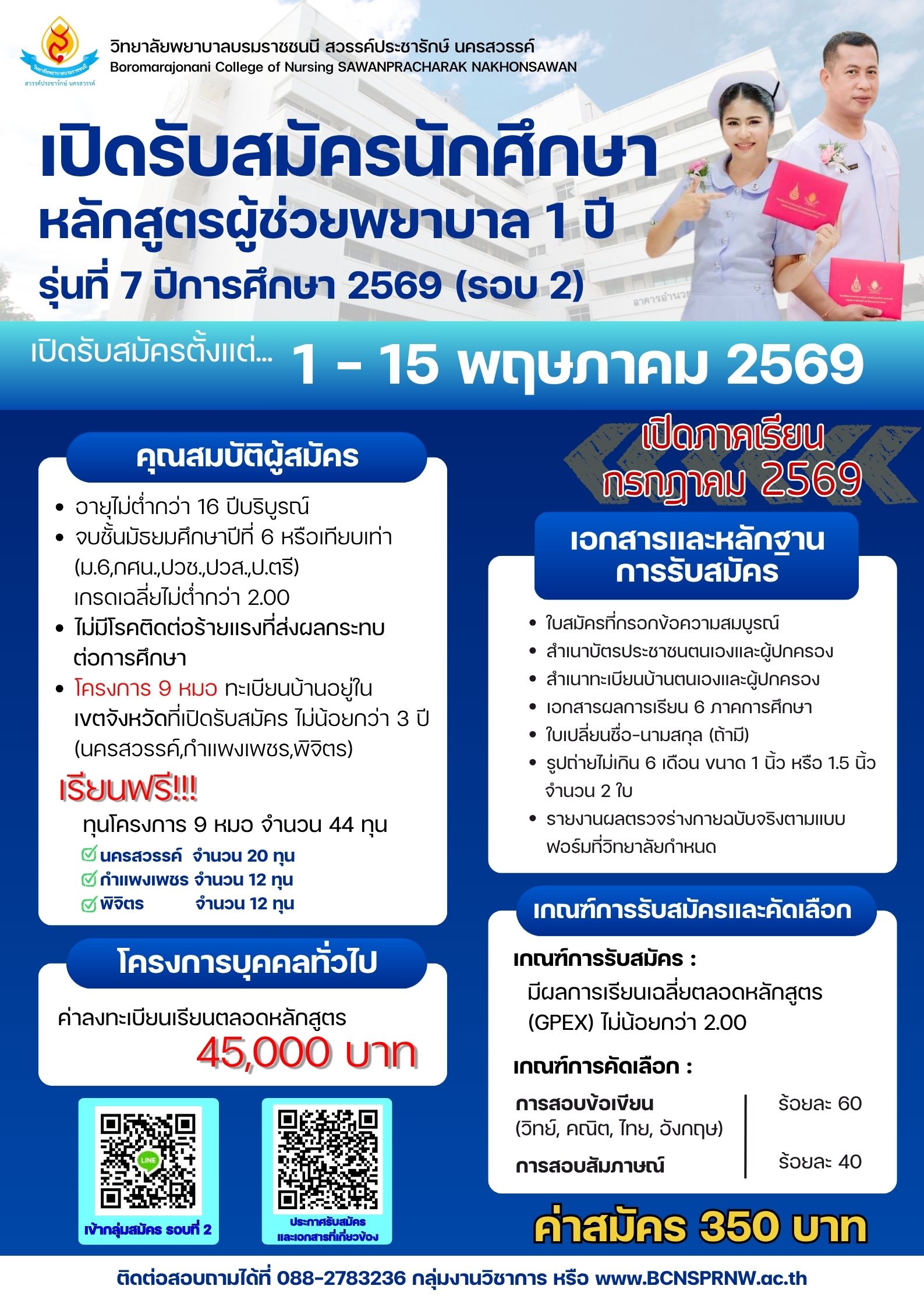 📌ประกาศเปิดรับสมัครนักศึกษาใหม่ หลักสูตรประกาศนียบัตรผู้ช่วยพยาบาล รุ่น 7 ปีการศึกษา 2569 📌