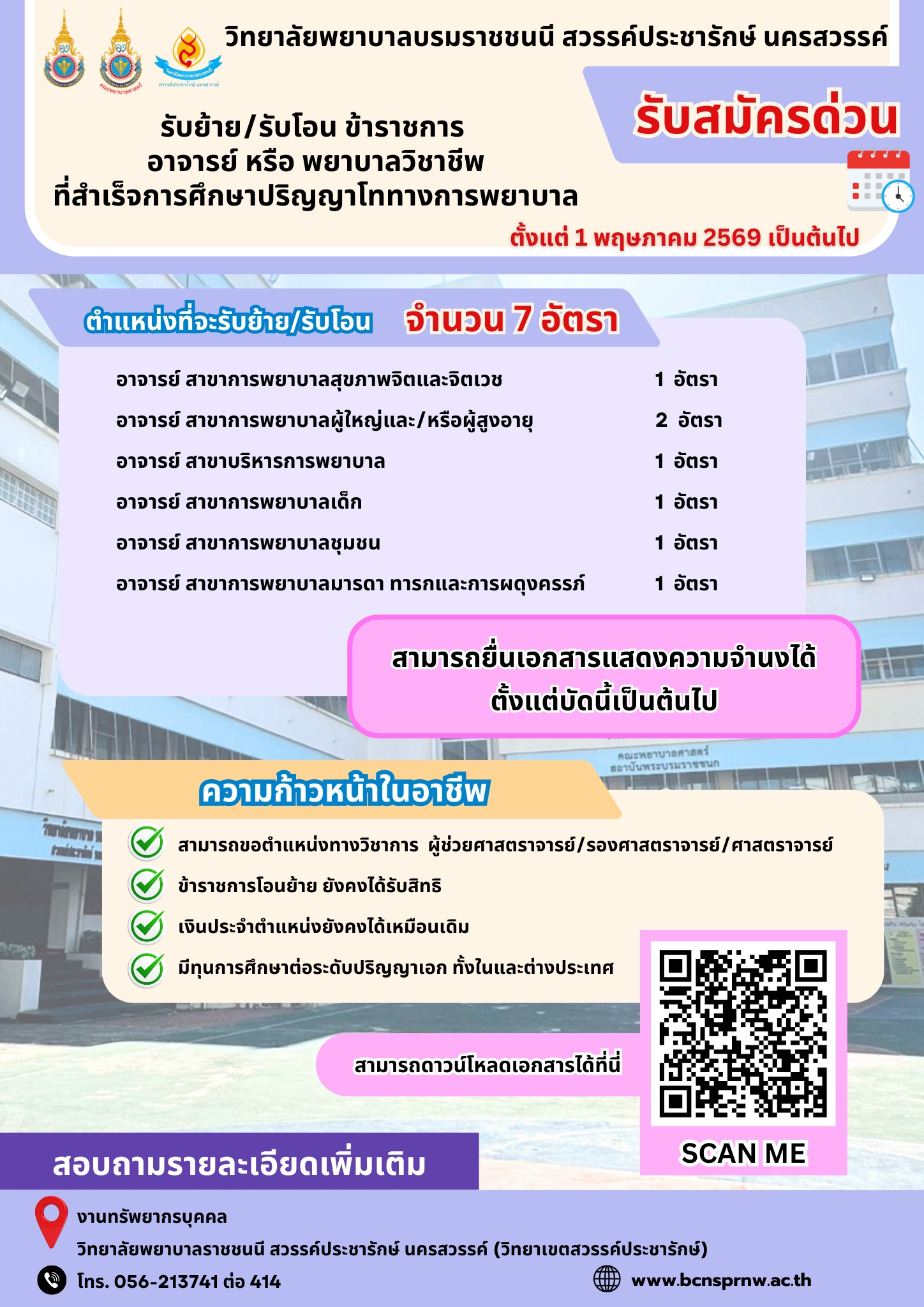 BCNSPRNW | รับย้าย/รับโอน ข้าราชการ อาจารย์ หรือ พยาบาลวิชาชีพ ที่สำเร็จการศึกษาปริญญาโททางการพยาบาล
